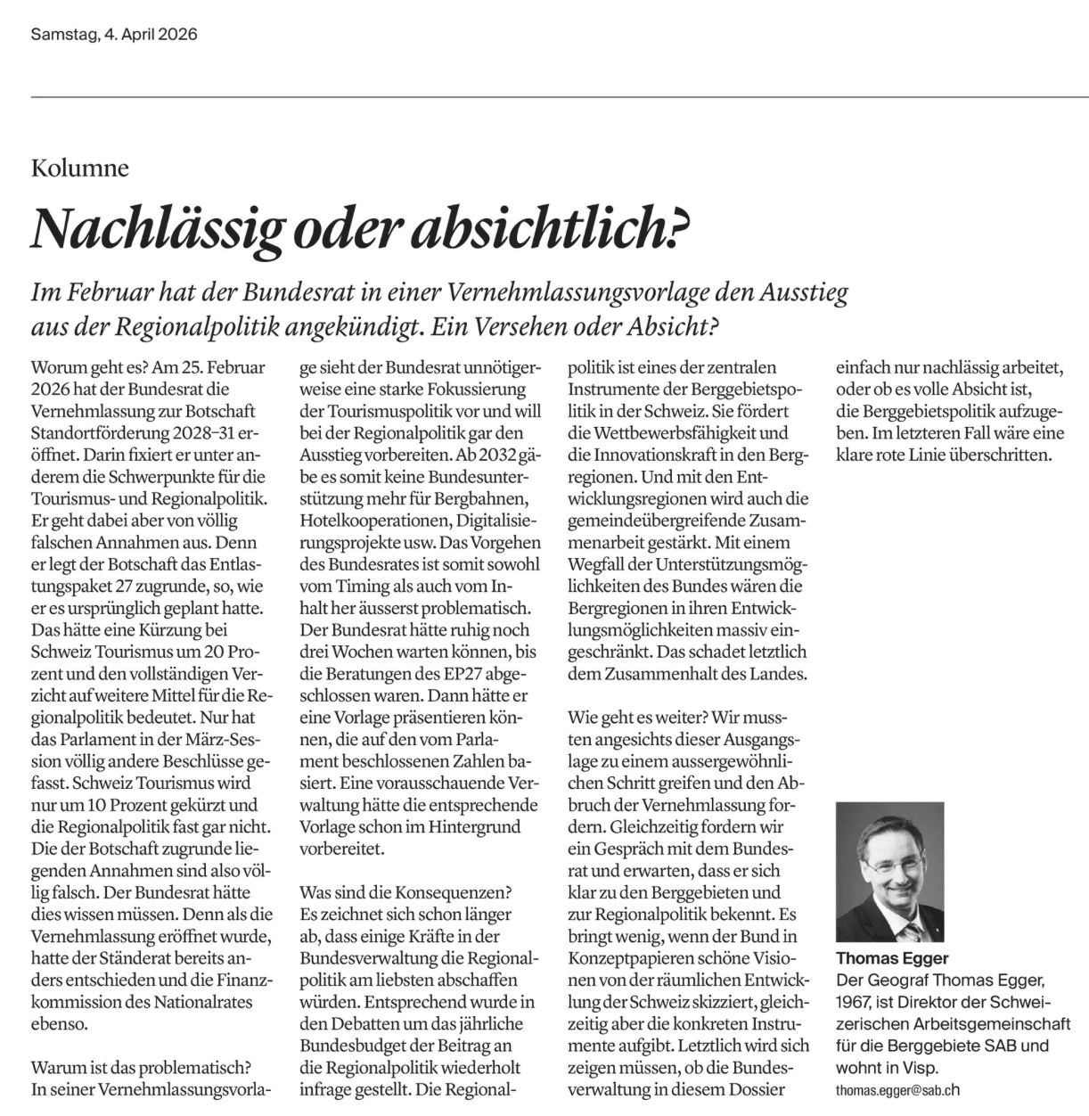 Ein Rückzug des Bundes aus der Regionalpolitik kommt nicht in Frage. Kolumne im Walliser Boten.