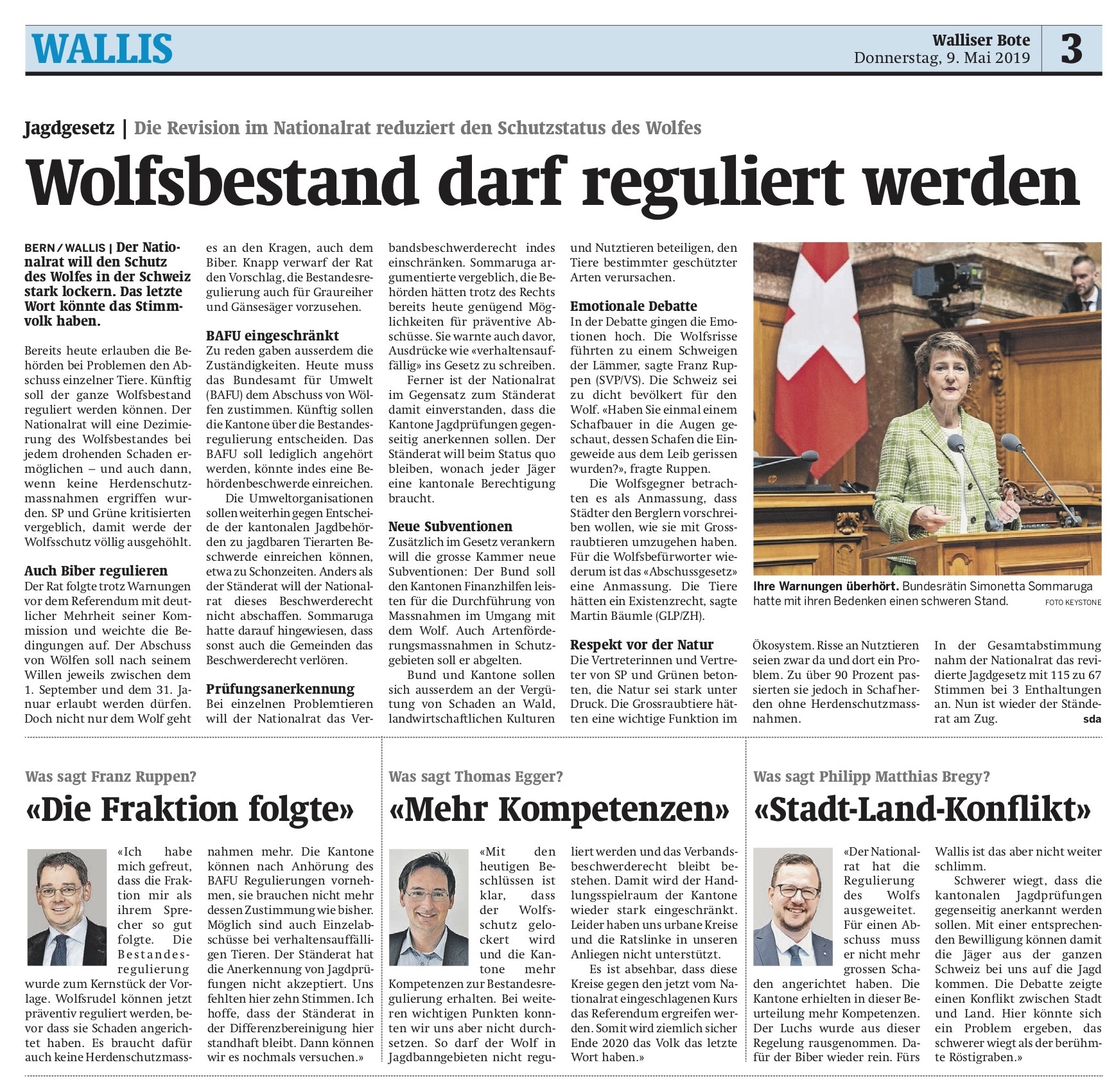 - 9. Mai 2019: Die Wolfsdebatte ist mit den Beschlüssen des Nationalrates einen Schritt weiter. Reaktionen im WB.